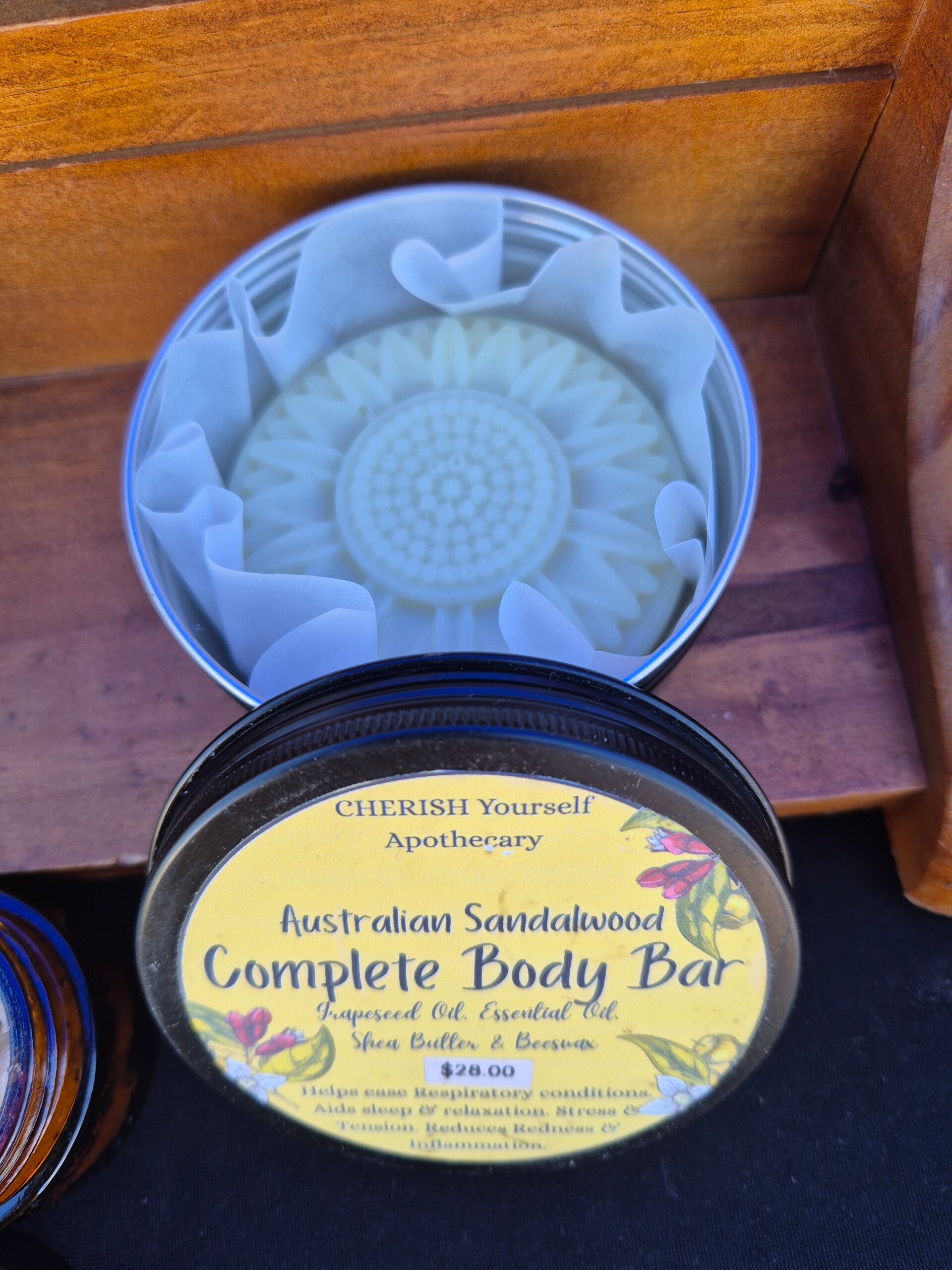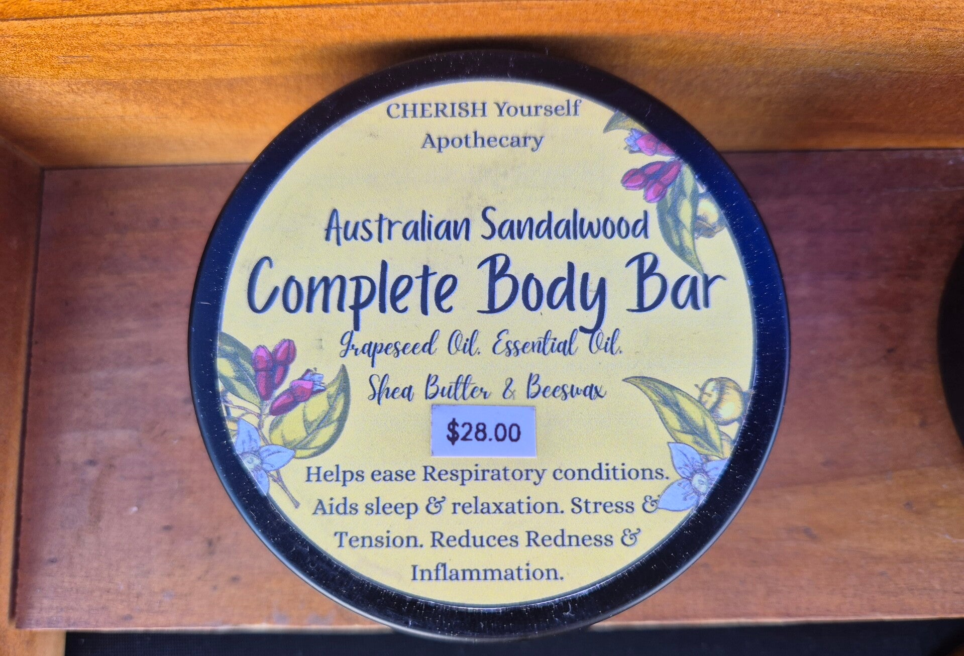 Sandalwood: respiratory, relaxation, tension, redness & Inflammation. (Essential oil, grapeseed oil, Shea Butter & Beeswax)