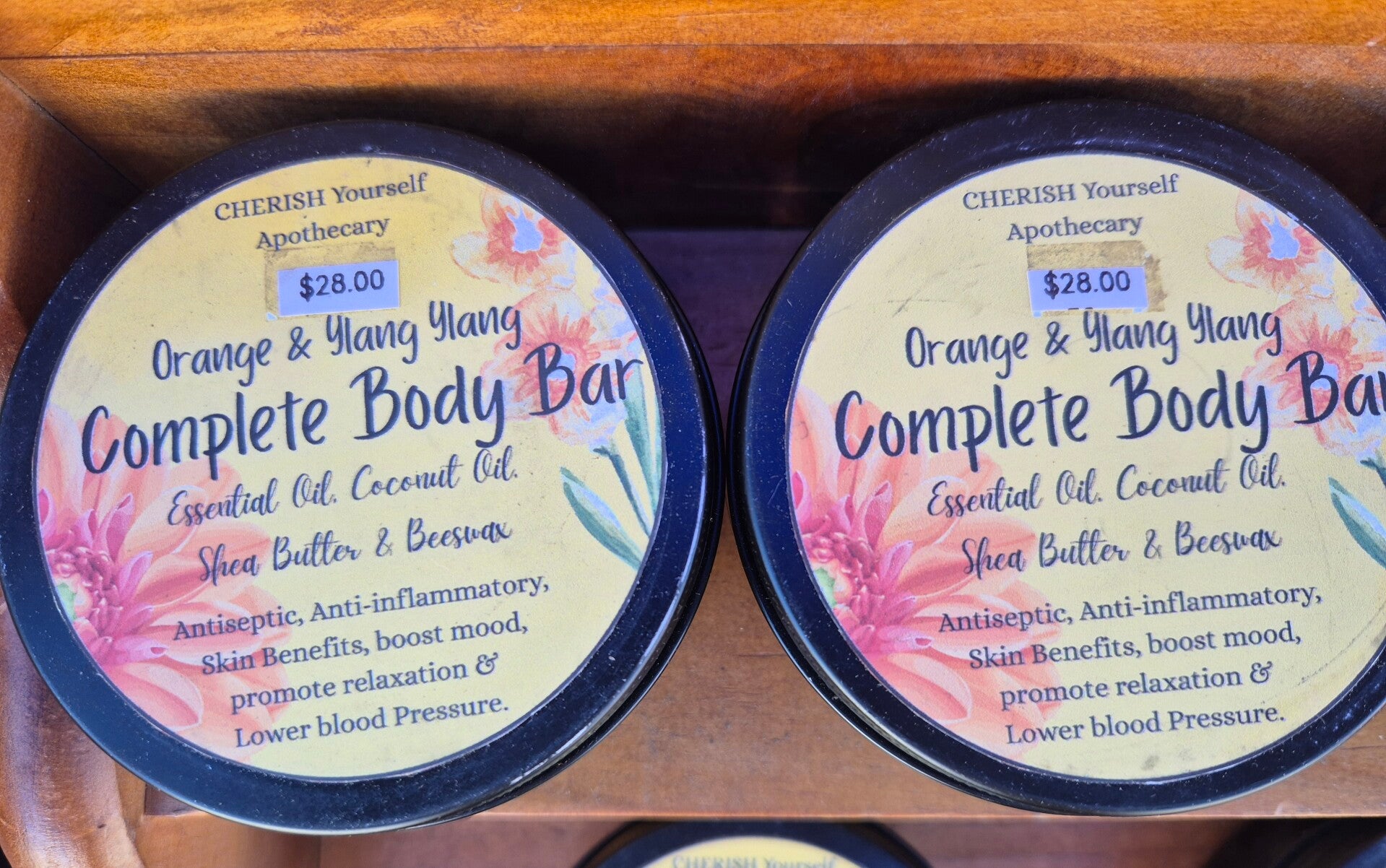 Orange & Ylang Ylang. Antiseptic, Anti-inflammatory, skin benefits, boost mood, promote relaxation and natural deodorant. (Essential Oils, Coconut oil, shea butter & Beeswax)
